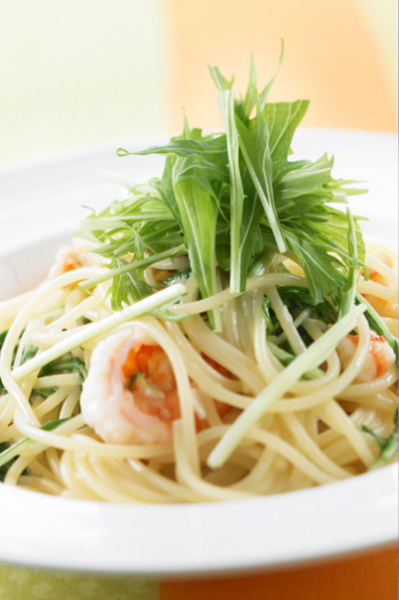 3.2に海老を入れて炒め、塩で味をととのえ、白ワインを入れてひと煮立ちさせ、火を止め、水菜(20g)を入れる。